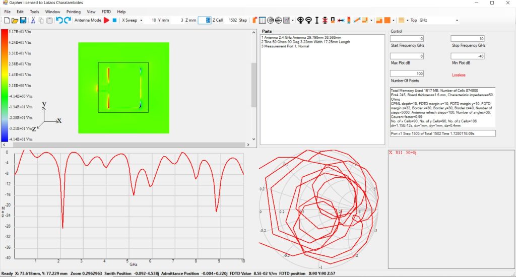 Gapher is a Radio Frequency and Microwave simulation software. It has a scattering parameter engine for designing circuits and an electromagnetic Finite Difference Time Domain engine for electromagnetic simulation. These two engines are integrated together in one seamless package.